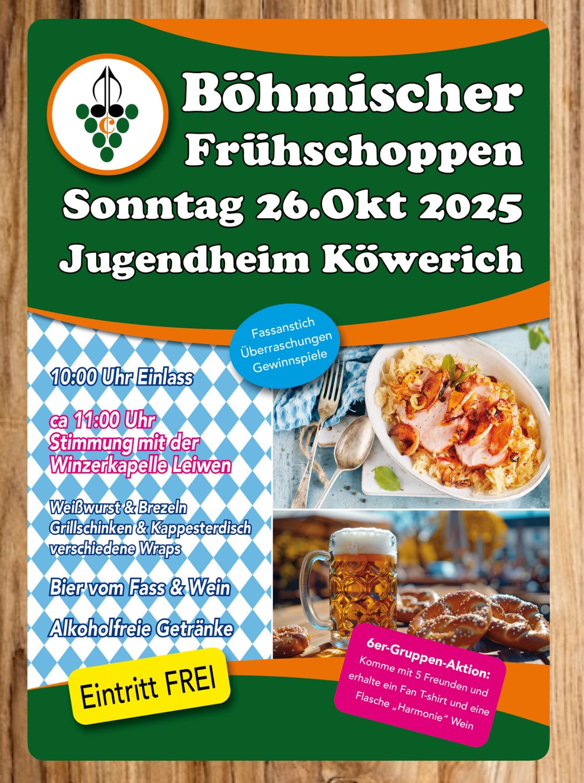 So26Okt11:00erstklassigBöhmischer FrühschoppenJugendheim Köwerich11:00 Jugendheim Köwerich